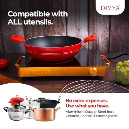 Cook faster, smarter, and safer with the DIVYA DP-88 Infrared Cooktop. Powered by 2000W radiant heating, this stylish black glass cooktop works with aluminium, steel, copper, and ceramic utensils — no special cookware needed.