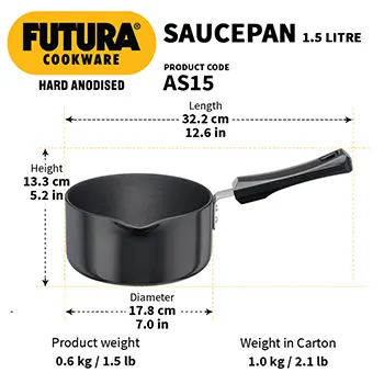 The Hawkins Hard Anodised Saucepan AS15 is a 1.5-litre durable saucepan designed for boiling, heating, and preparing sauces with ease. Made from premium hard anodised aluminium, it offers long-lasting durability, even heating, and smooth pouring with minimal drips.